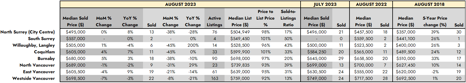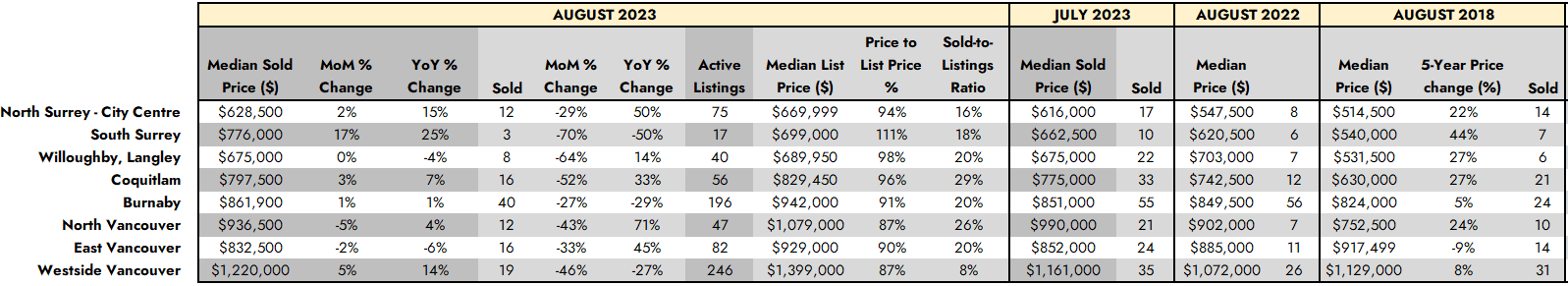 - In August 2023, only 17 homes were sold, while the total inventory stands at 196 homes. South Surrey, Surrey, and Langley collectively represent nearly 60 percent of all available entry-level, newer-home supply.