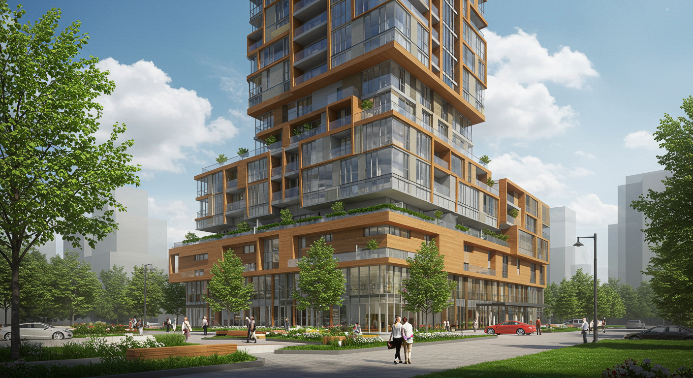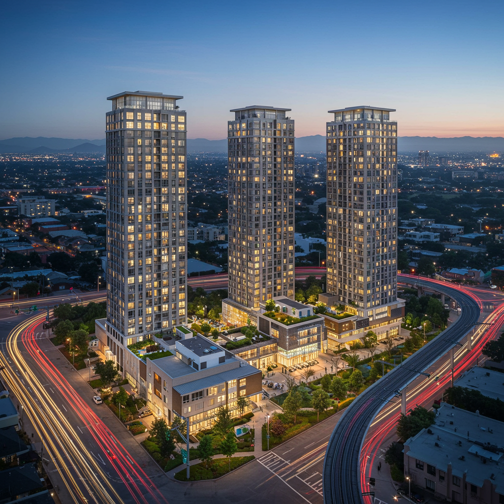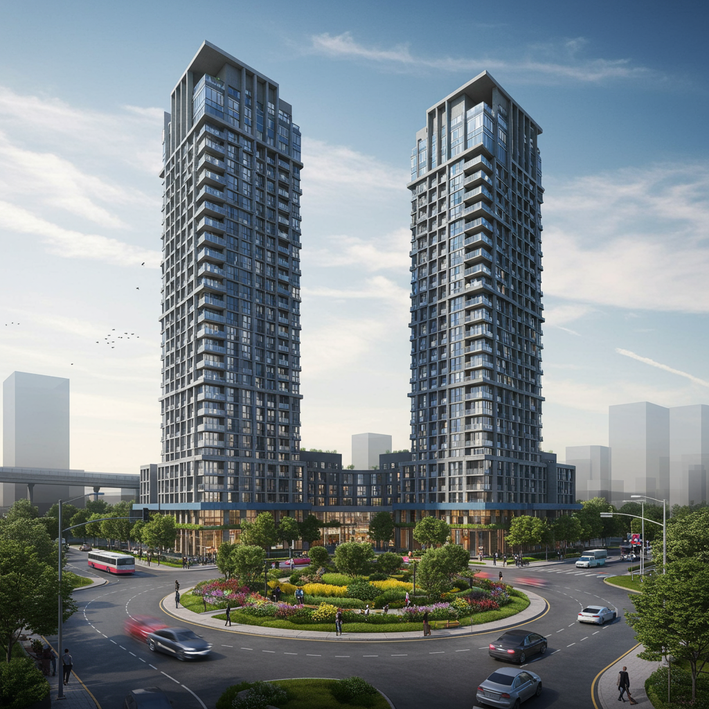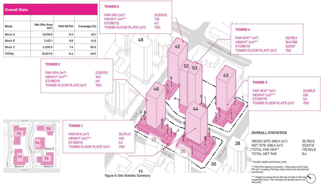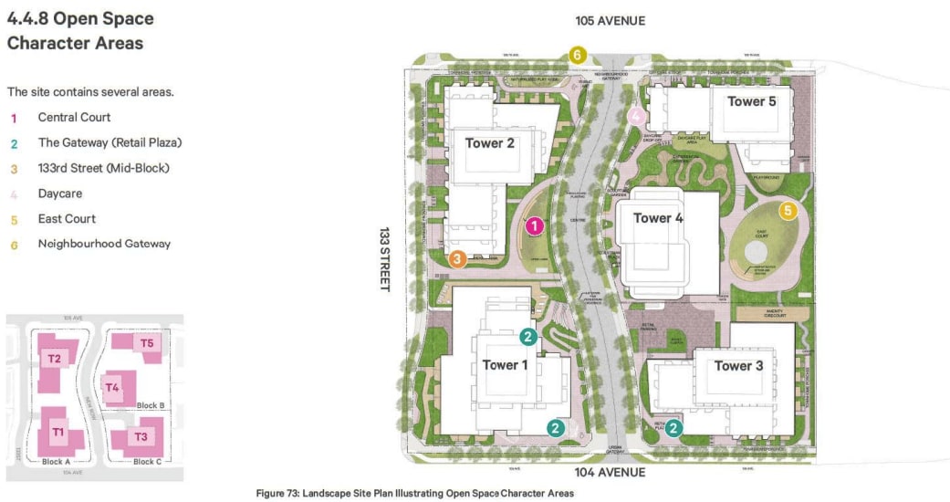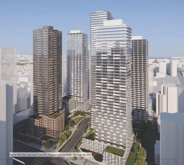 Tower 1 and Tower 3 (rental component) are part of the initial application, with Towers 2, 4, and 5 to follow sequentially. Both towers are located along 104th Avenue and will feature a commercial retail node along the avenue.