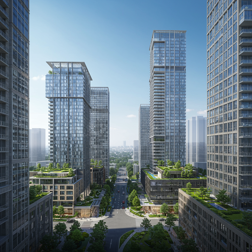 This totals 1,876,601 square feet of residential space and 15,532 square feet of commercial space, including nearly 11,000 square feet of retail. The master plan also includes approximately 50,000 square feet of indoor amenity space, featuring a gym and fitness center, co-working/lounge areas, an entertainment/media room, a sports court, and a pool and wellness center.