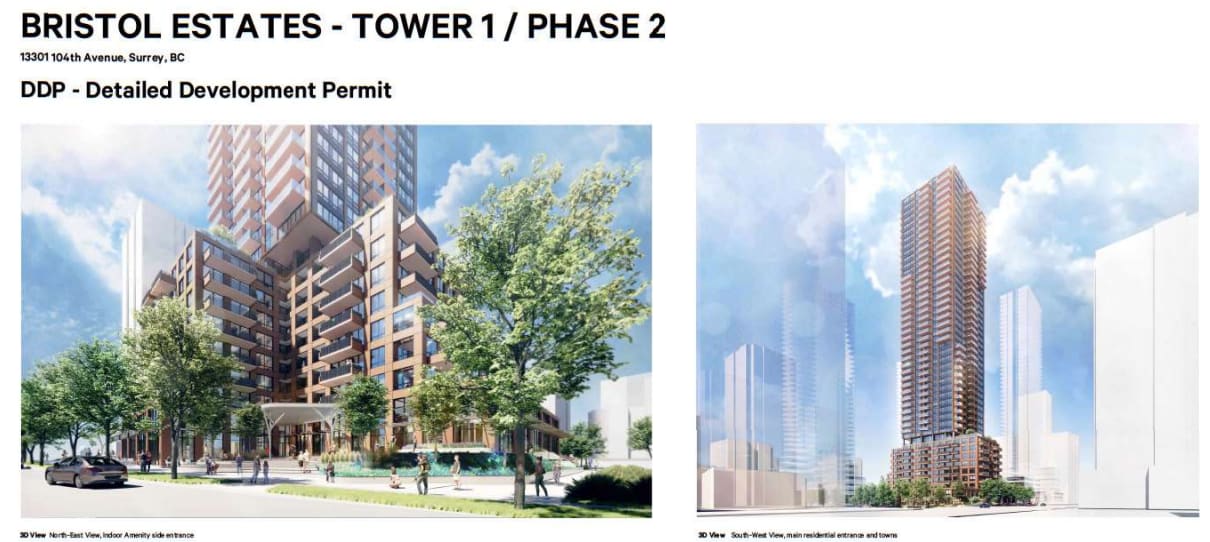 Bosa Properties acquired the Bristol Estates property in 2022 for $170 million. The original applicant, Landmark Premiere Properties, had planned five market condo buildings ranging from 38 to 48-storeys and one 11-storey market rental building, with a total of 2,000 strata condos and 170 market rental units.