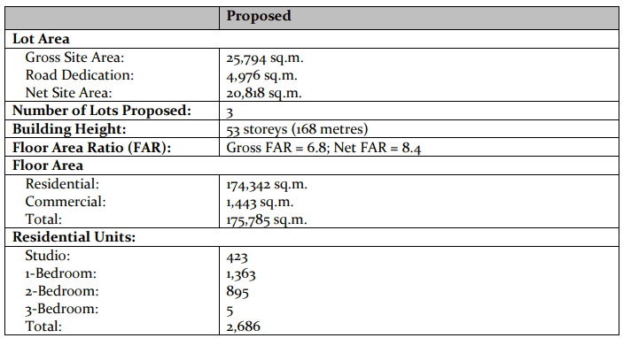"The proposed density and building height are supportable at this location in the West Village District of City Centre. The proposed overall net density is 8.4 Floor Area Ratio (FAR). The proposed building heights, that range from 42-storeys to 52-storeys, and overall massing of the project are generally consistent with City Centre Plan goals."