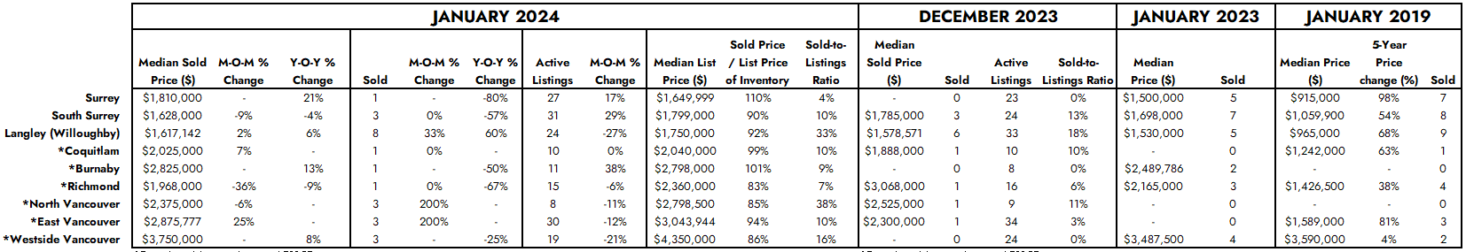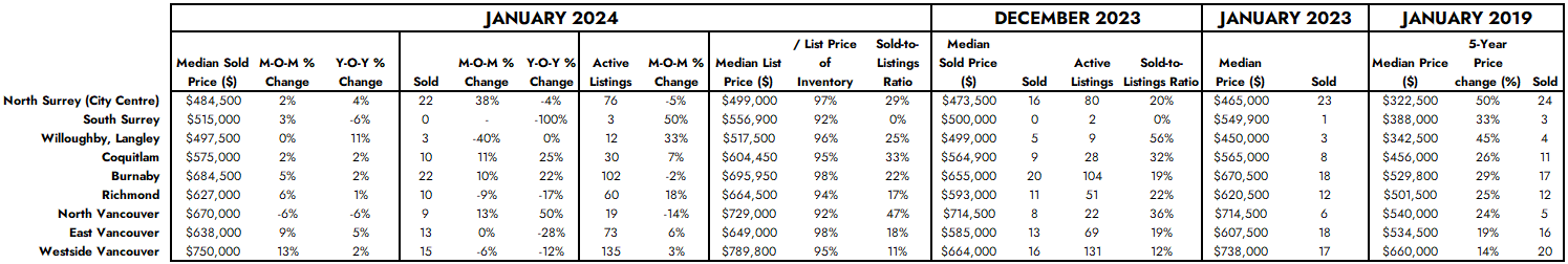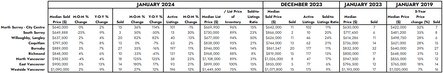 Surrey, South Surrey, and Langley collectively account for more than half of the monitored townhome inventory and serve as the main contributors to new supply growth. These are also the only markets with inventory available for less than $1,000,000.
