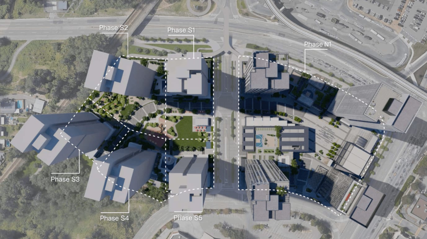 "Key to the site design is the vast amount of public space the master plan provides, including generous space along the commercial frontages, Pinetree Plaza, the Central Square, the High Street, the Urban Park, and landscape improvements to the adjacent city-owned land and planned off-site."